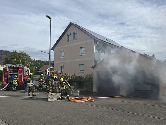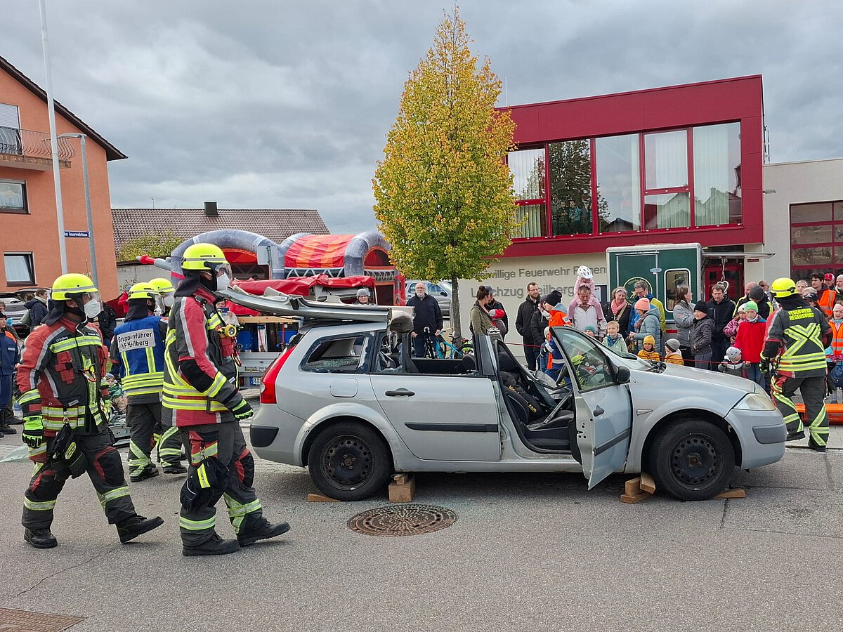 Neben informativen Einblicken und interessanten Gesprächen sorgten vor allem die Schauübungen für staunende Gesichter. Zunächst demonstrierten die Einsatzkräfte ihr Können bei einem simulierten Garagenbrand. Hier konnten die Gäste hautnah miterleben, wie schnell und koordiniert die Feuerwehr im Ernstfall vorgeht. Im Anschluss folgte eine realistische Personenrettung nach einem Verkehrsunfall. Dabei wurde mit einer Säbelsäge das Dach eines Fahrzeugs entfernt, um eine „verletzte Person“ sicher zu befreien.